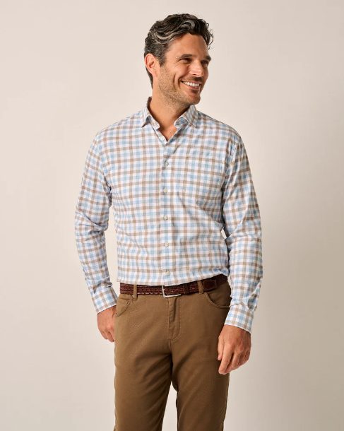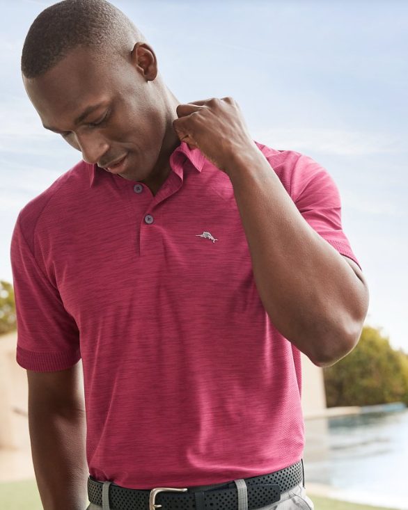 Add a button-down shirt by 7 Diamonds or Johnny O! and if you’re feeling bold, try a print to spice up your appearance. You can’t go wrong with a plaid in a color that compliments the hue of your pants. If you want something more casual, look for a crisp Polo shirt.